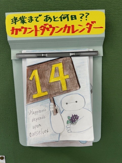 卒業まであと・・・ 公開日 2026/02/13 更新日 2026/02/13 3年生 3年生の教室前にあるカウントダウンカレンダーも残り14日までめくられました。3年生は県立高校の出願に向けて今日が三者懇談最終日。県立高校受験の日も目前に迫ってきています。
