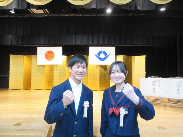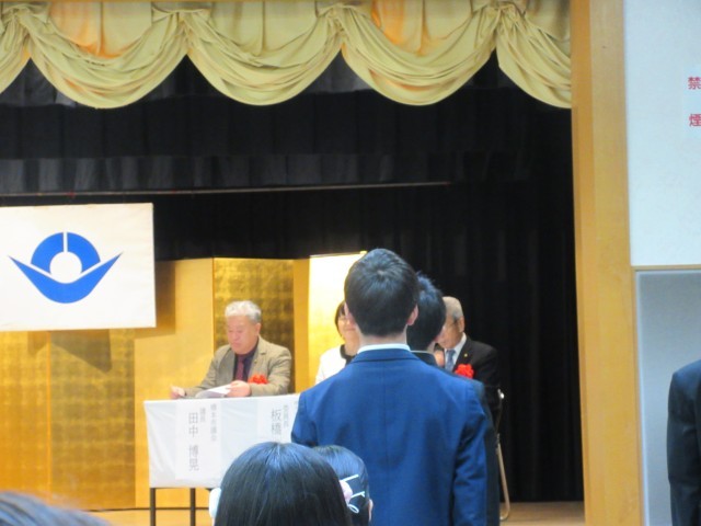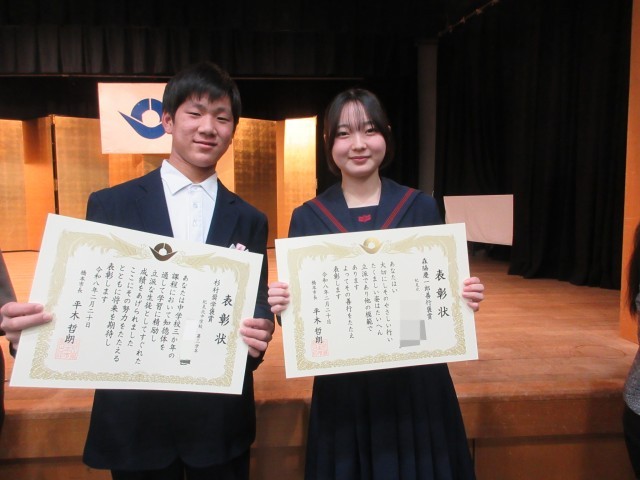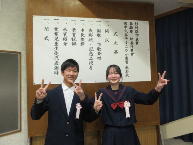 この賞は中学校生活において他の模範となる行いが認められたものです。本校からも2名の生徒が選ばれ、平木市長から表彰していただきました。