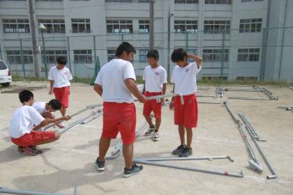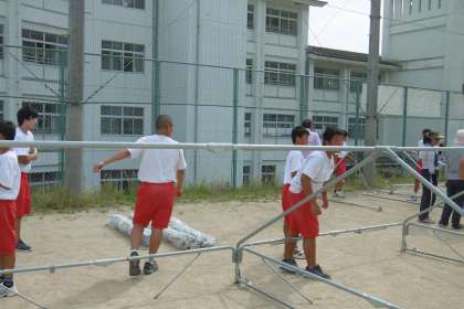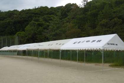 明日の予行です。 生徒席にはテントを張って準備しています。熱中症にならないために十分な水分を用意してください。