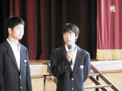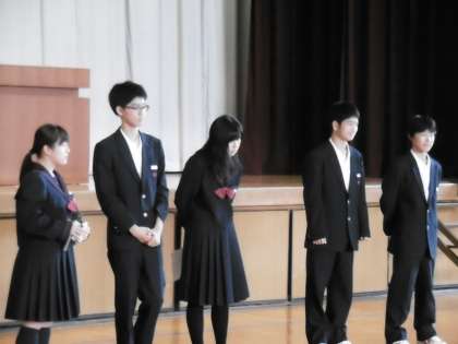 生徒会解任式 公開日 2016/10/21 更新日 2016/10/21 学校行事 続いて生徒会解任式が行われました。会長の柿花くん、副会長の宇土さん、三木くん、書記の尾上さん、出見くんよりあいさつがありました。会計の池田くんは本日欠席でしたが、柿花くんから紹介がありました。「ひとりでは難しいことも、仲間がいたからできた」。 様々な活動の中心となって動いてくれた生徒会のみなさん、一年間の生徒会活動ご苦労さまでした!