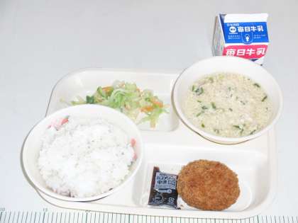 ご飯、牛乳、ミンチカツ、ボイルキャベツ、かきたま汁、ソース小袋