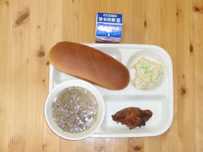 4月13日(木) パン、牛乳、鶏肉のスパイシー焼き、ポテトサラダ、きのこスープ