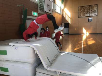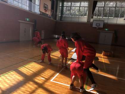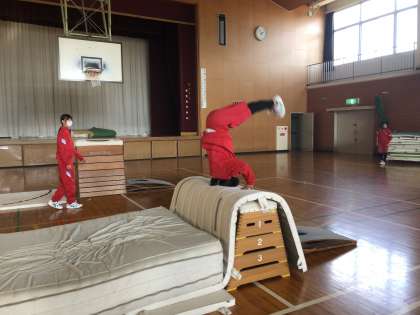 2年は、体育で跳び箱をしています! ウォーミングアップ、マットで練習、頭はねとびができるようになりました。