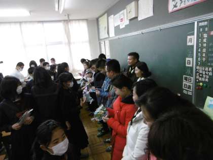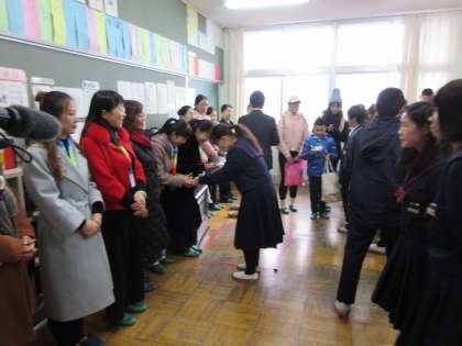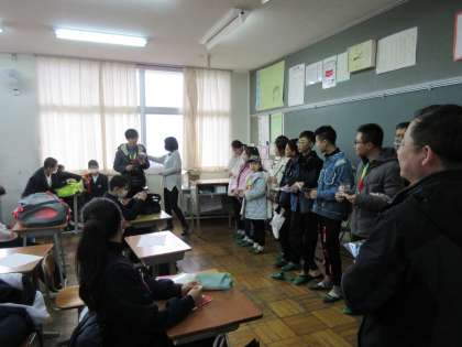 白城毓才実験学校来校・終わりの会 公開日 2018/01/23 更新日 2018/01/23 学校情報 終わりの会では両校の記念品を交換しました。 紀見北からは日本の風景や名所の絵はがきと鶴などの折り紙を手渡ししました。