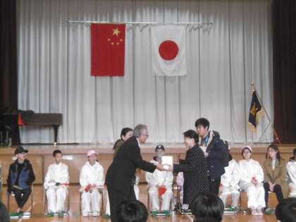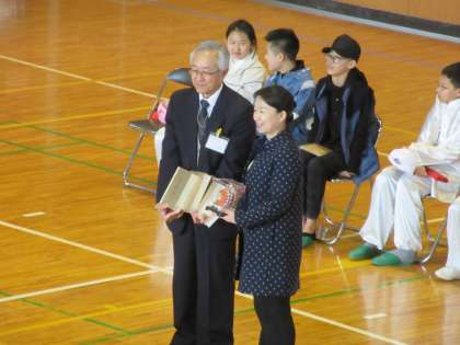 両校の校長先生が記念品を交換しました。紀見北中学校からは「紀州てまり」をお渡ししました。