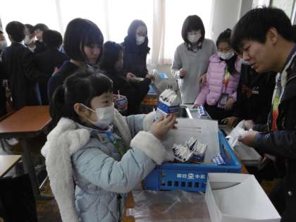 1年生は給食も一緒に食べました。牛乳パックの回収の仕方も説明をしました。それを通訳してもらい協力して回収しました。