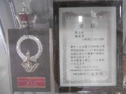 先日、2月18日に開催された「第17回和歌山県市町村対抗ジュニア駅伝競走大会」で、橋本市のチームが第4位に入賞した盾と賞状です。