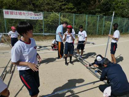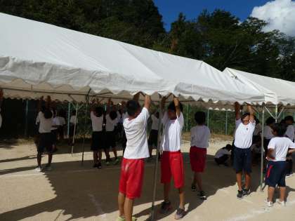 体育祭練習 公開日 2019/09/10 更新日 2019/09/10 学校行事 午後の選抜リレー、クラブ対抗リレーの入退場の練習をしている間に応援席のテントを張りました。毎日暑い日が続いているので大変ですが生徒のみなさんはよくがんばっています。