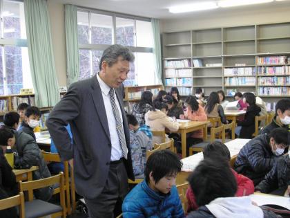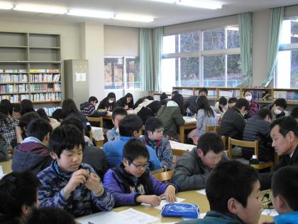 体験入学 公開日 2014/03/11 更新日 2014/03/11 学校行事 3月11日(火) 三石小学校の6年生体験入学です。 図書室での授業風景。 優しい教頭先生の数学です。 「算数」から「数学」へステップアップします。