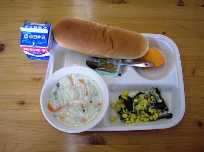 11月11日 パン、クラムチャウダー、ほうれんそうとコーンのサラダ かき