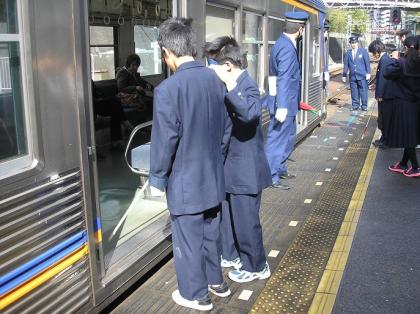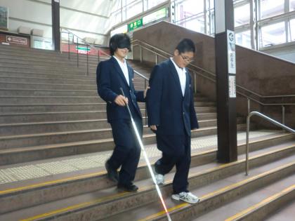 本日は、1年A組が白杖を使った乗車体験をしました。生徒たちは、ガイド役、ブラインド役、サポート役と与えられた役割をしっかりこなしていました。