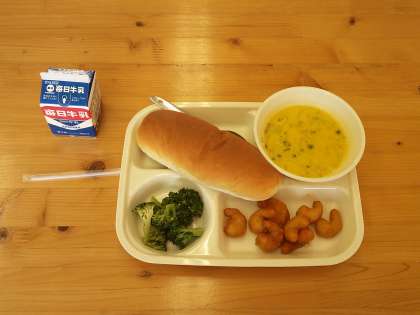 12月17日(木) パン、牛乳、えびフリッターのチリソース、ボイルブロッコリー、かぼちゃのポタージュ
