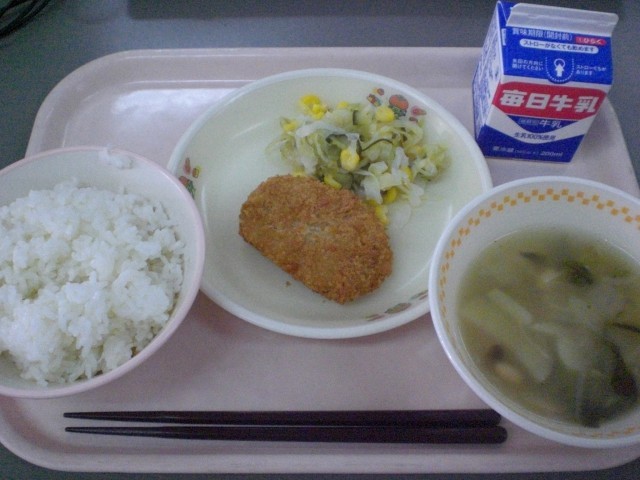 今日のメニューは カレーコロッケ コールスローサラダ 具沢山スープ ご飯 牛乳 です。今週で一学期も終わります。今日は後期の生徒会役員選挙・立会演説会が行われます。3年生から2年生へ色々な場面でバトンタッチがされていきますね。候補者の皆さん、しっかりと食べて緊張に負けずに頑張ろう! いただきます!