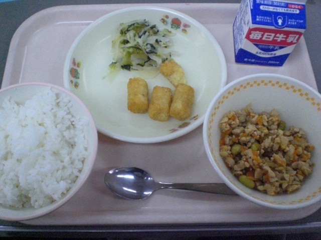 本日のメニューは ゆずかあえ ミニポテト 鳥丼ぶり 牛乳 です。 今日は体育祭予行の予定でしたが、あいにくの雨。明日に延期です。週末に向けて天気が上り坂になってくれますように! しっかり食べて、午後からも頑張ろう! いただきます!