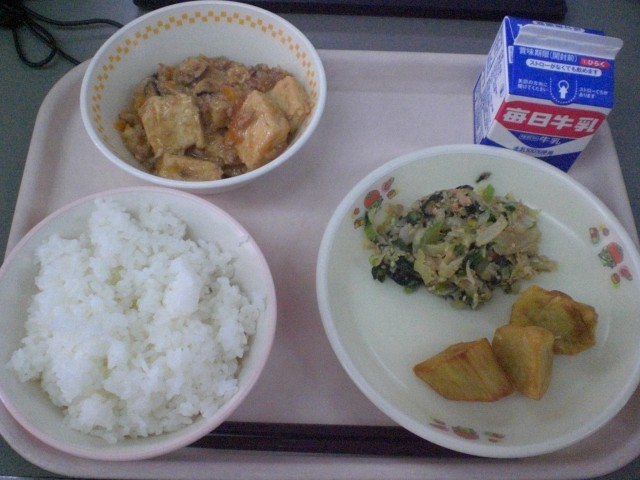 本日のメニューは マーボー厚揚げ ナムル フライドスイートポテト ご飯 牛乳 です。 明日は高中祭、楽しもう! いただきます!
