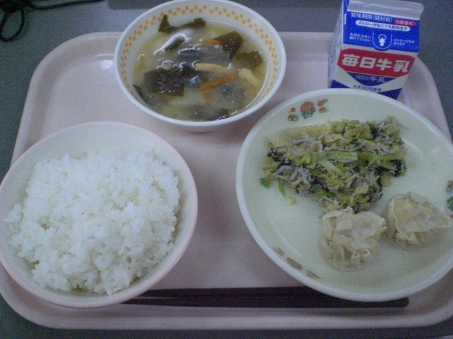 本日のメニューは コーンシュウマイ キャベツの甘酢和え わかめと豆腐の味噌汁 ご飯 牛乳 です。今日は高中祭。午後からは3年生の部です。しっかり食べて元気にパフォーマンス! いただきます!