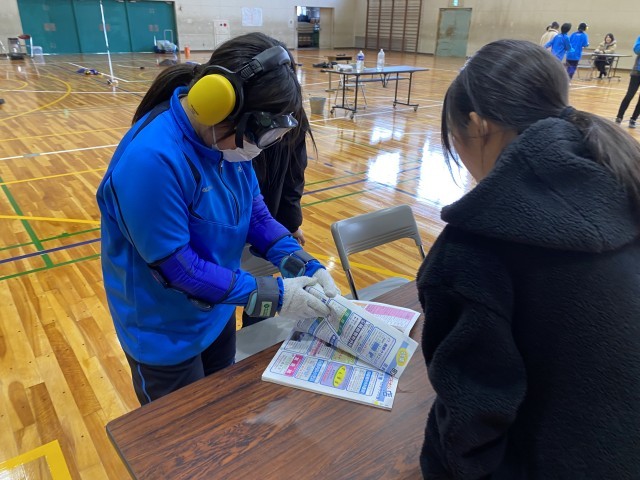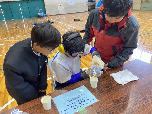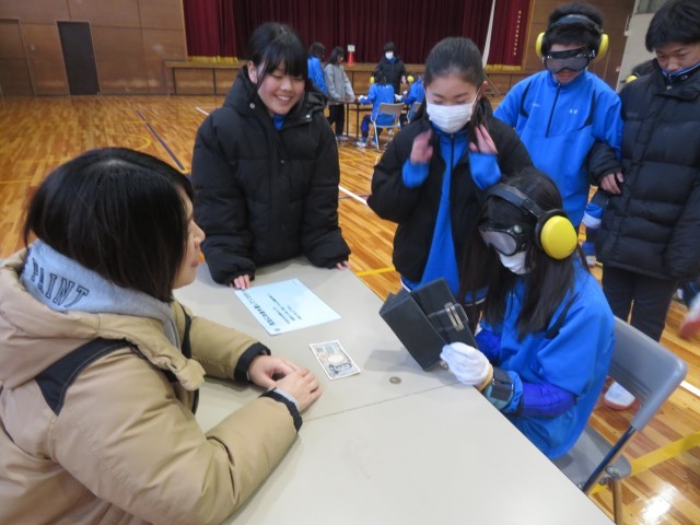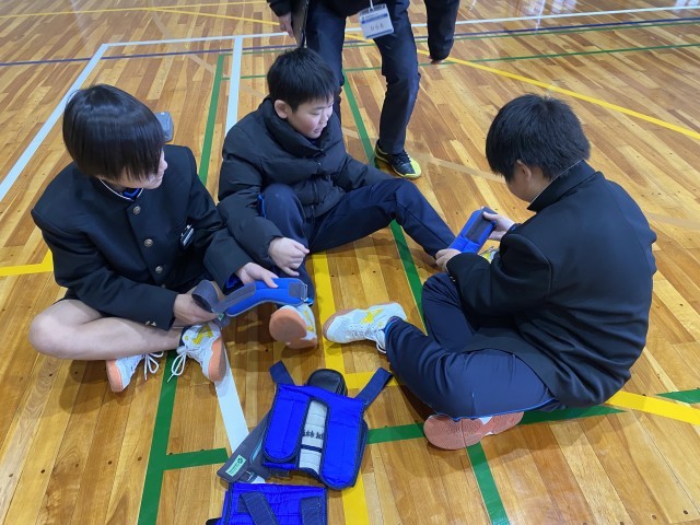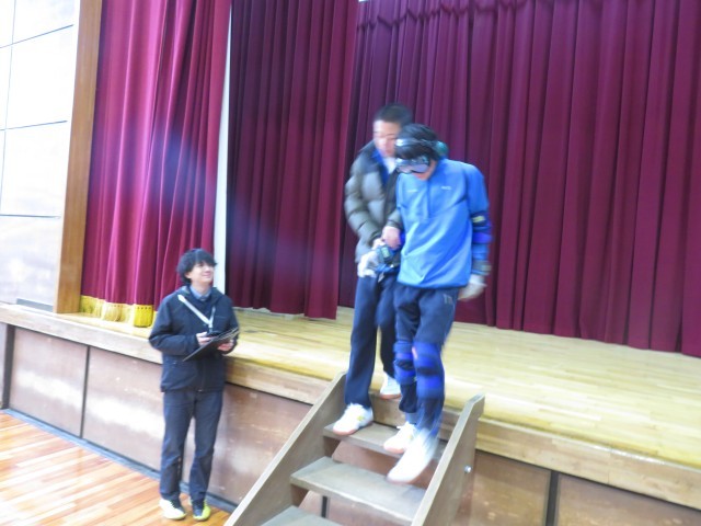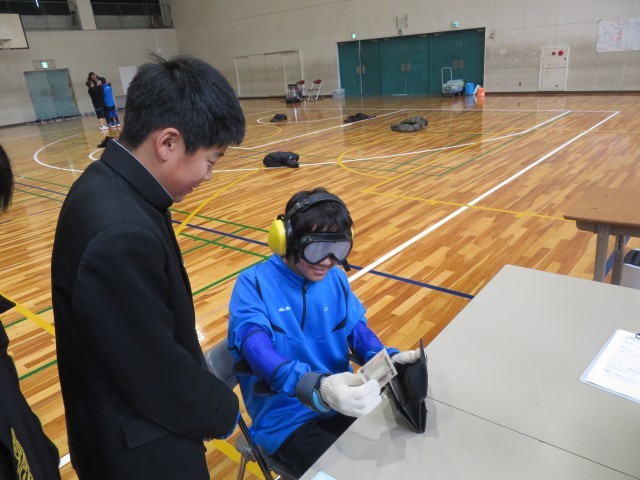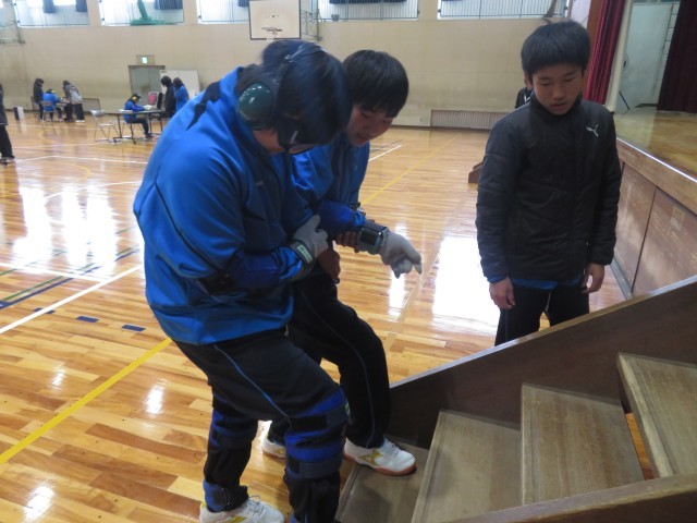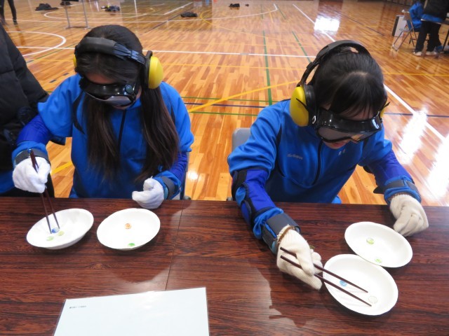 重りやゴーグルをつけると視界が悪く、実際に動きづらそうにしていた生徒を介助役の生徒が身体を支えてしっかりとサポートして真剣に取り組む様子がみられました。