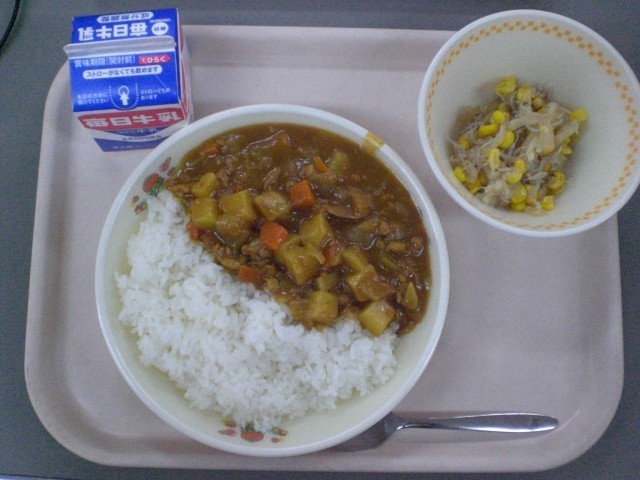 本日のメニューは 大根サラダ ひねどりと柿のカレーライス 牛乳です。 今日も寒いですね。少しインフルエンザがでてきました。手洗いうがいをおこない、早寝早起きとしっかり食事でウイルスに負けない体を! いただきます!