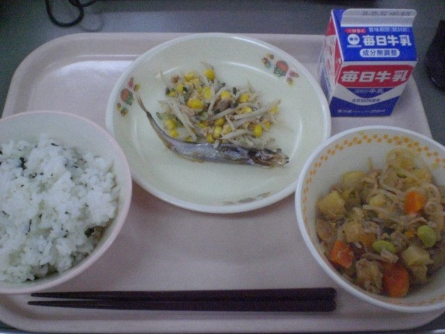 今日の給食 公開日 2026/04/22 更新日 2026/04/22 今日の給食 今日のメニューは ごぼうサラダ 肉じゃが やきししゃも わかめご飯 牛乳 です。 今日は授業参観日、しっかり学習しているところを参観してもらおう! いただきます! いいね(0)
