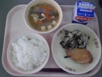 今日のメニューは タラすりみカツ うめおかかあえ とうふとたまねぎのみそしる ごはん 牛乳 です。 いよいよ明日から中間テスト頑張れ!いただきます!