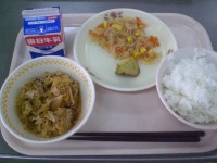 本日のメニューは 豚キムチいため 春雨サラダ 一口焼き芋 ご飯 牛乳 です。今日...