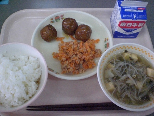本日のメニューは 甘酢肉団子 ニンジンしりしり ビーフンスープ ごはん 牛乳 です。 一気に肌寒くなりました。体調を崩さないようにしましょう。しっかり食べて午後からも頑張ろう、いただきます!