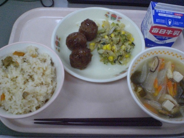 本慈雨tのメニューは 和風肉団子 キャベツの胡麻ドレッシング 豆腐と大根の味噌汁 ご飯 牛乳 です。今日は雨。肌寒いですね。しっかり食べて午後からも頑張ろう! いただきます!