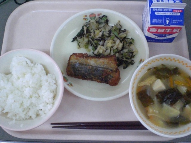 本日のメニューは 鰆の竜田揚げ しそひじき和え わかめと豆腐の味噌汁 ご飯 牛乳 です。 今日は午後から身体測定。しっかり食べて大きくなろう!いただきます!