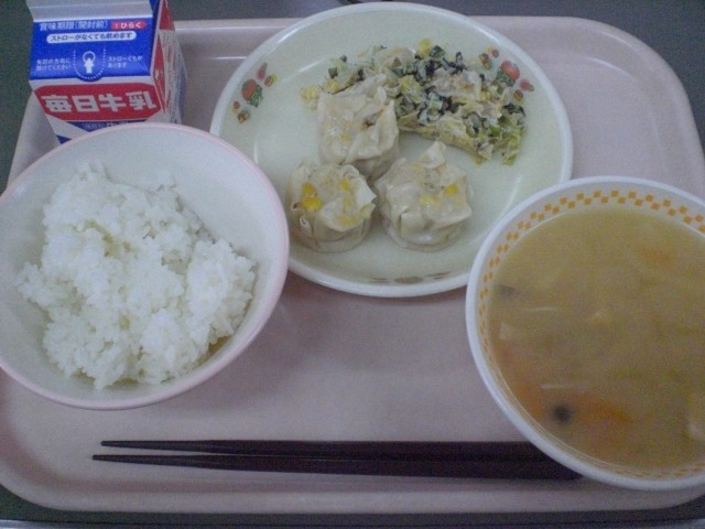 今日のメニューは コーンしゅうまい キャベツの胡麻マヨネーズあえ ジャガイモの味噌汁 ご飯 牛乳 です。 朝からの雨もあがり、すごしやすい気候です。しっかり食べよう、いただきます!