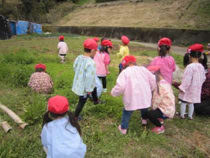 小学校の畑の近くで、つくしやたんぽぽ、はこべ、