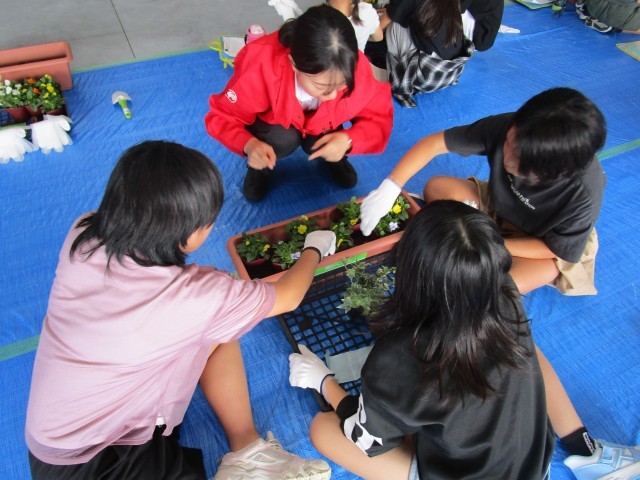 最後にみんなで花の寄せ植えをしました。プレゼントしていただいた寄せ植えは玄関に並べました。玄関が花でいっぱいになってうれしいです。