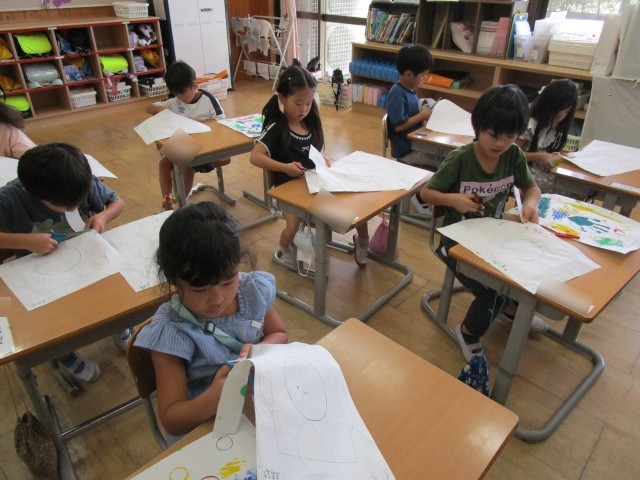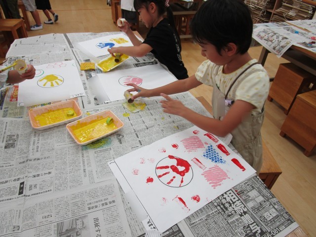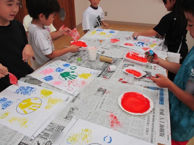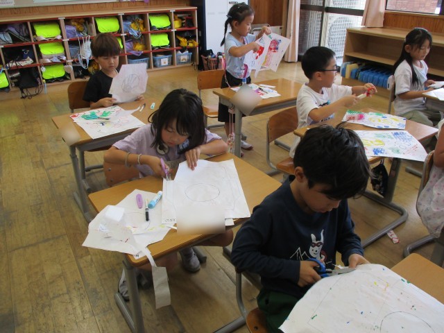先週の図工の学習で、ペットボトルキャップやネットなどの廃材に絵の具をつけて、ぺったんしたり、ころころしたりしていろいろな模様を作りました。この作品を使って、世界に一つだけの封筒を作りました。今日お家に持って帰っているので、中身も見てあげてください。