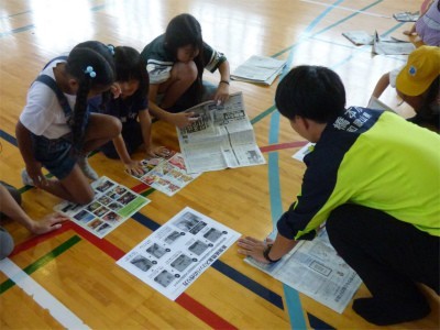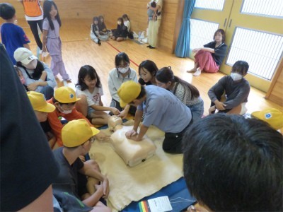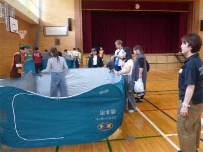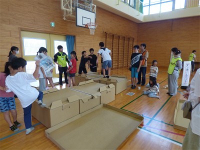 体育館内では、パーティション設営・新聞スリッパ・段ボールベッド・救護体験・心肺蘇生の体験を行いました。