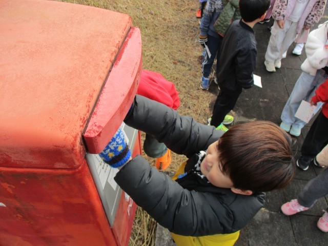 今日は、国語の時間に卒園したこども園の先生に書いた年賀状をポストに出しに行きました。一生懸命書いた年賀状が、無事に届きますようにと、みんなで願いました。