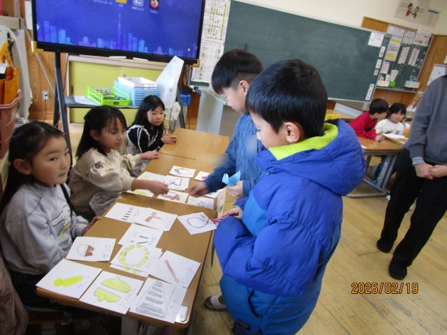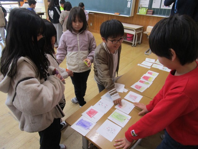 国語の学習で準備していたおみせやさんに、2年生を招待しました。子どもたちは、「これください。」「どうぞ。」と、笑顔でやり取りをしていました。自分たちで一生懸命作った商品を2年生が買ってくれると、「買ってくれた!うれしい!」と、とても喜んでいる姿が見られました。