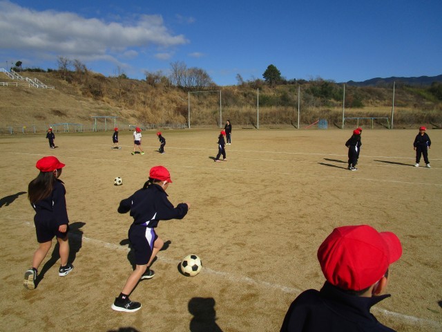 体育の学習では、ボールを蹴ったり、止めたりする活動に挑戦しています。相手がいるところに蹴ることが、少しずつ上手になってきました。次は、これまでにできるようになってきたことをいかして、新しい動きにもチャレンジしていきます。