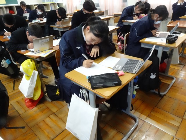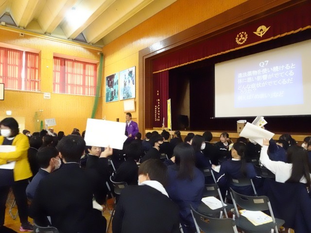 11月6日(木)5限目に「薬の正しい使い方」、「薬乱用防止」について学びました。ちょっとしたきっかけや好奇心から始める薬の乱用が、健康的な生活を損なうだけでなく、最終的にはかけがえのない人生を損なう危険性があることを学習し、生徒たちは必死でメモを取っていました。後半にはクイズ形式で、薬乱用についての問題についてグループワークがあり、熱心に取り組んでいました。6時間目には、学んだことをもとに「薬物乱用防止新聞」作成しました。