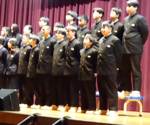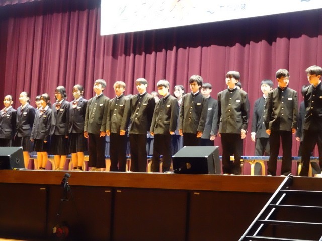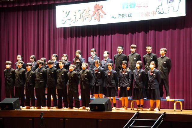 文化祭でも、体育祭に引き続き団結力を見せてくれました。今年は3部合唱だったので、パート別に分かれて懸命に練習していました。その練習の結果を3クラスとも大いに舞台で発揮してくれました。結果は、学年の最優秀賞はA組でした。おめでとうございます! また、生徒会執行部も司会をアドリブを入れながら、うまく進行してくれました。2年生、頑張っています!
