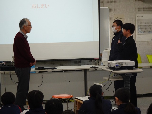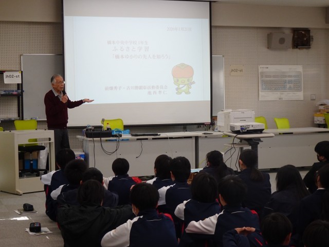 1月21日(水)4限 1年生総合学習の時間に、元「前畑秀子・古川勝資料展示館」の館長であられた池西孝仁先生をお招きして、ふるさと学習を行いました。橋本市にゆかりのある人物を紹介して頂きました。その中でも今年生誕90周年を迎えた本校出身で、戦後水泳界初の金メダリストである古川勝氏について、スライドや動画、漫画などを通して、その功績を詳しく教えていただきました。「夢(目標)を持つこと」「努力を惜しまないこと」「やりはじめたら最後までやり抜くこと」そして『自分なりの金メダルを目指そう』というお言葉をいただきました。偉大な先輩を見習い、頑張って欲しいと願っています。
