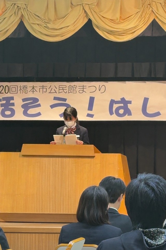 3月7日、8日に第20回橋本市公民館まつりが開催されました。大きなにぎわいを見せる中、8日に行われた「話そう!はしもと」では、1年生の西川さんが「今、大切に思うこと」をテーマに、1年間の中学生活をふりかえって感じた自身の思いや、これからの学校生活で頑張りたいことを自分の言葉で発表しました。