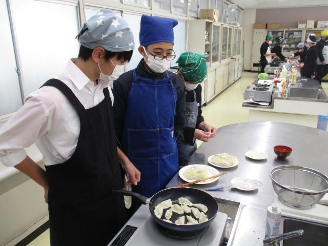3月9日 2C調理実習 公開日 2026/03/10 更新日 2026/03/09 2年生 3月9日(月)の3・4限の家庭科の時間に、2年C組で調理実習が行われました。実習内容は餃子作りで、野菜を切る、調味料を計る、こねる、包む、焼くという工程を班ごとに担当を手分けして行いました。それぞれ個性のある餃子を作り、最後はみんなで美味しくいただきました。 +2