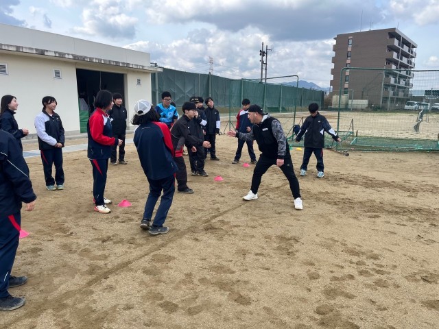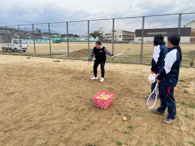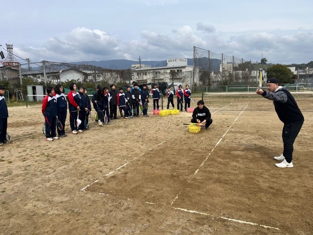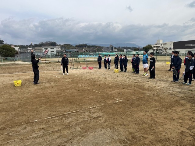 土曜日にモノリスの古賀選手、竹綱選手が来て頂きました。2人も何度も日本一になった事がある方々で、意識の高さを教えてもらいました。まずはアップの仕方を丁寧に教えてもらい、バックやサーブも指導して頂きました。質問をする生徒もたくさん居り、個別にカットサーブを教えてもらう生徒もいて、充実した時間になりました。また朝からコート整備も生徒と一緒に手伝ってくれました。4月の春の大会に向けて頑張りましょう。